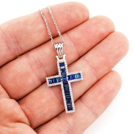 Sapphire Cross With Diamond Halo Pendant Necklace Attached 14k Solid Gold 2.90ctw