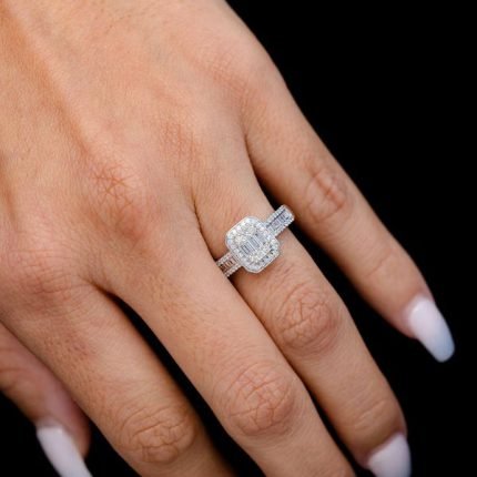 Baguette Cluster & Round Diamond Halo Engagement Ring – All Natural – 0.50ctw