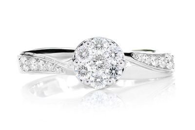 - This elegant diamond engagement ring features a dazzling round cluster of diamonds at the focal point, creating a brilliant and textured centerpiece.