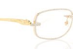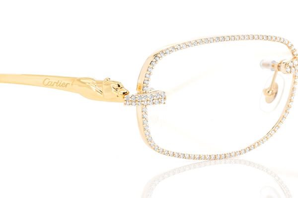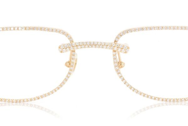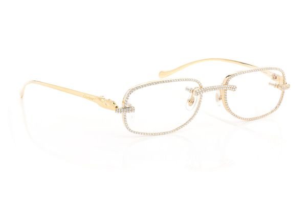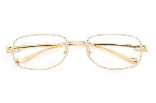 These Cartier glasses are Gold & Transparent and come with 2.90ctw of diamonds. The frame size of these glasses have 52mm lens width, 18mm bridge and 130mm from temple to temple. These glasses do not come with the manufacturer’s warranty. In place of the manufacturer’s warranty, we offer a 12-month Icebox warranty.