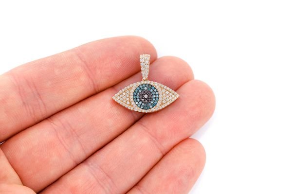 - Designed as an evil eye, the VS white, blue, and black diamonds are thoughtfully set to create a jaw-dropping piece.