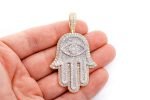 - The hamsa design, adorned with stunning diamond detailing, represents positivity and strength, while the intriguing evil eye at the center adds depth and mystery.