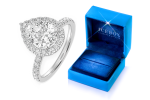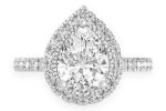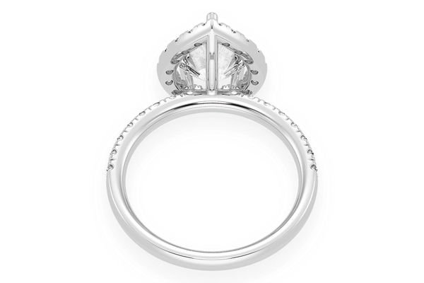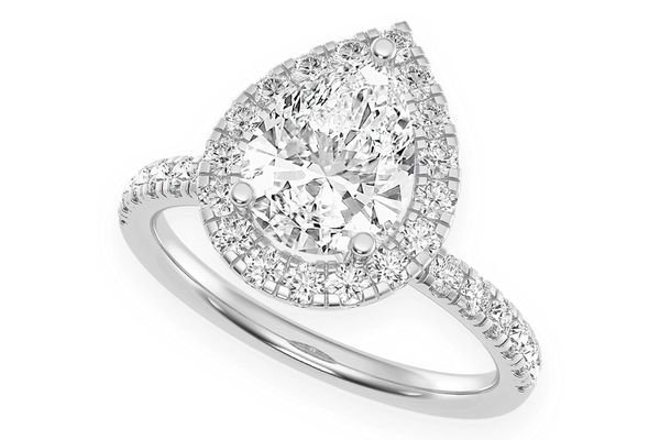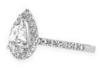 - It features a stunning 1.50ct pear-cut center stone surrounded by a majestic halo of diamonds, which continue gracefully down the band.