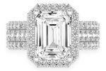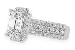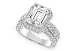 - This magnificent and stunning diamond halo engagement ring features a dazzling 3.00ct emerald cut center stone exuding impressive sparkle and elegance.